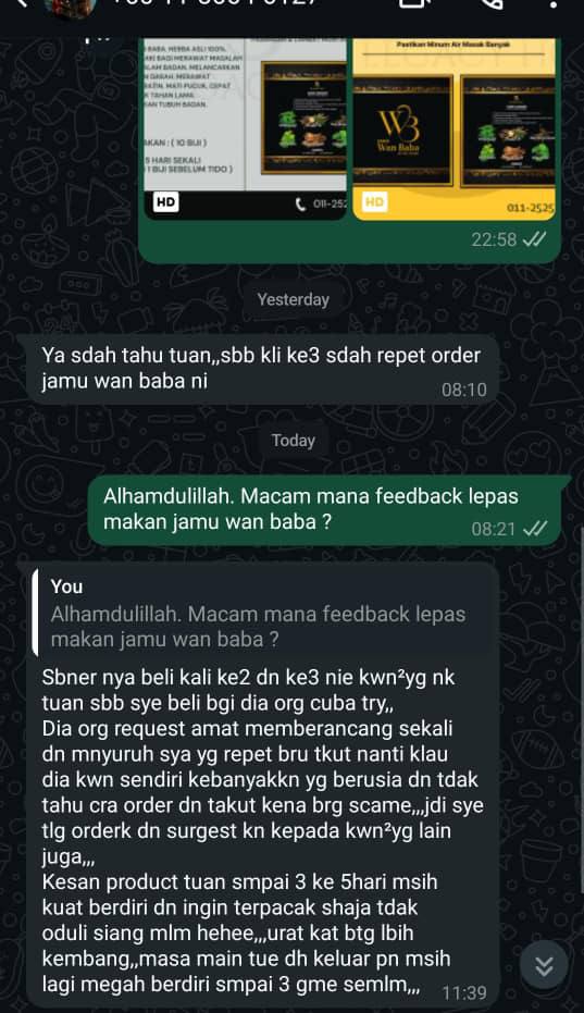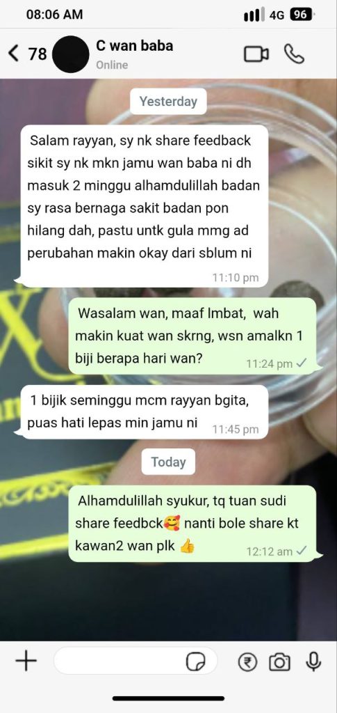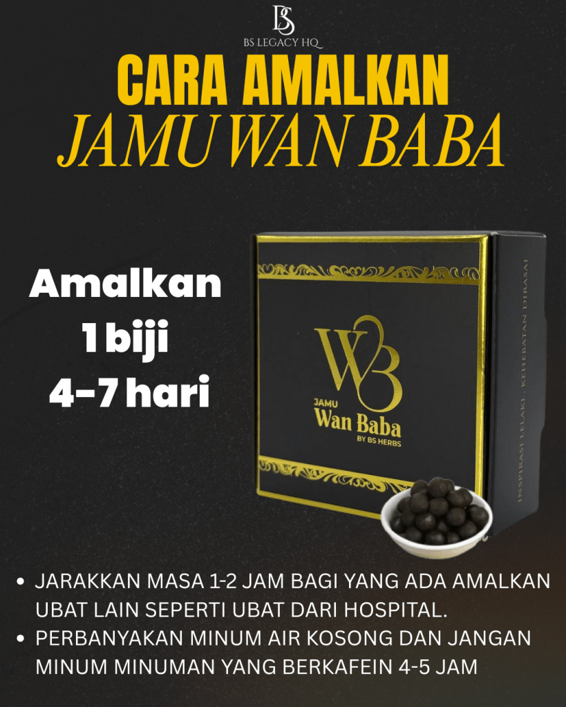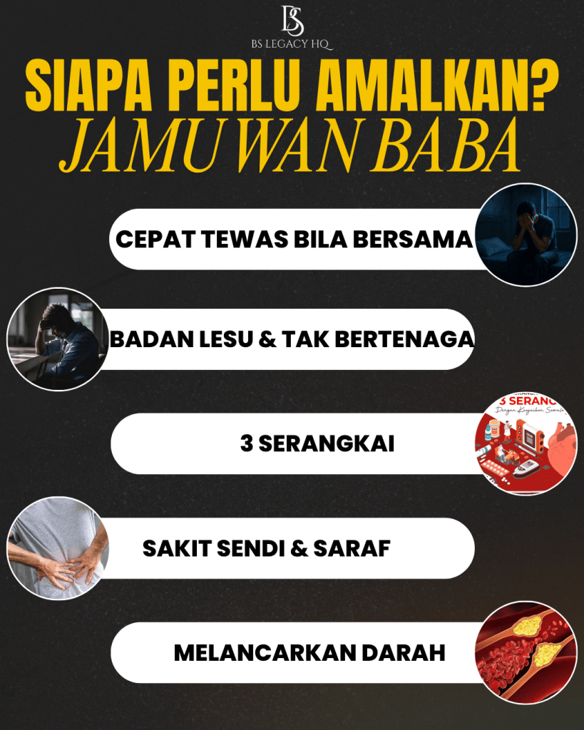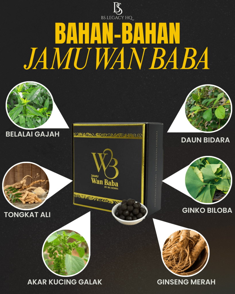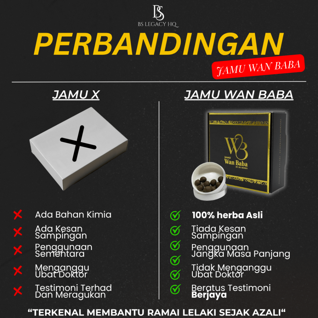 Jamu Wan Baba ialah formulasi herba tradisional yang diwarisi sejak turun-temurun dan kini diperbaharui dengan ramuan premium yang lebih berkesan. Dirumus khas untuk lelaki yang alami masalah cepat tewas, badan lesu & tak bertenaga, 3 serangkai dan darah tak lancar – tanpa sebarang bahan kimia berbahaya. Ramai pengguna melaporkan kesan positif seawal 4-7 hari, menjadikan Jamu Wan Baba pilihan utama untuk kekal bertenaga dan sihat luar dalam.